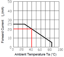正向電流(IF):直流驅動時,電流大小不能超過25mA。當溫度超過25 ̊C時,請參考下圖2的減額曲線,例:40 ̊C時電流大小不可超過20mA。