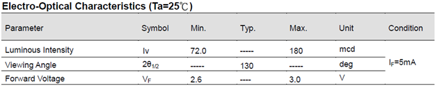 發光強度(IV):電流5mA驅動時,亮度範圍在72~180mcd。