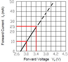 正向電壓(VF):電流由LED正極流向負極時,正、負極間產生的電壓稱為正向電壓。5mA驅動時VF範圍2.6V~3.0V。VF 會隨著IF成正比變化。如下圖5,10mA驅動時 VF=3.0V;25mA驅動時VF = 3.4V。