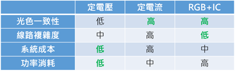 LED 常見的三種驅動方式特色比較如下圖 9,建議使用者依據需求選擇不同的產品、驅動 方式。