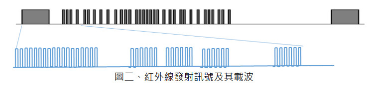 紅外線遙控器的應用也是一種無線訊號傳輸,跟大部分的無線傳輸技術一樣,為了避免環境中同波長電磁波的干擾,故會在其傳輸訊號上加上如圖二所示的載波(carrierfrequency),在遙控應用的載波範圍為 30~60kHz,而 38kHz 為最常見的載波頻率。