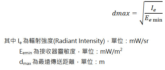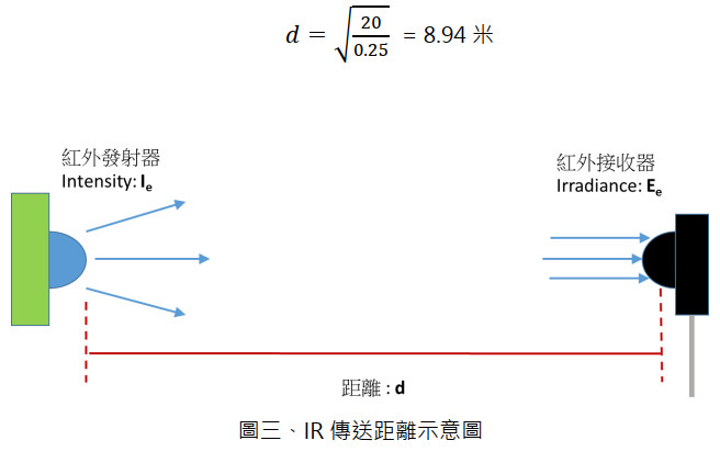 在無干擾(含光、輻射及電路)情況下,如圖三的 IR 發射強度及傳送距離關係可參考底下公式: