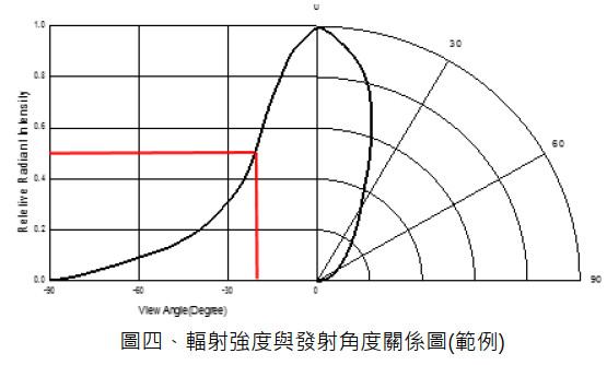 在 IR LED 規格書中有定義在某一固定電流下 0 度角時的輻射強度,其值會隨著角度變化而衰減,而可視角(View Angle)為衰減到 1/2 強度時的角度,其定義方式請參考圖四紅線部分。