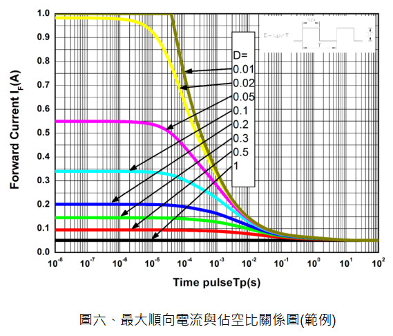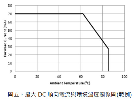 另在規格書中會標明最大連續輸出電流(Continuous Forward Current),此值通常定義在環境溫度(TA=25℃),若要操作在其他環境溫度,則需參考規格書中如圖五的最大 DC 順向電流與環境溫度關係圖。另若想要的接收距離大於以最大連續輸出電流的強度發射時的接收距離,可參考最大順向電流與佔空比關係圖(此圖在不同環境溫度也會有不同的曲線)加大發射電流。以圖六為例,在連續發射的情況下最大操作電流為 50mA,但若以佔空比 50%來操作可把發射電流加大到 100mA,若以佔空比 30%操作最大發射電流則可提高到 150mA。