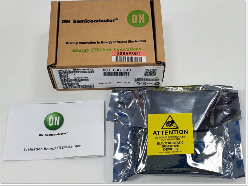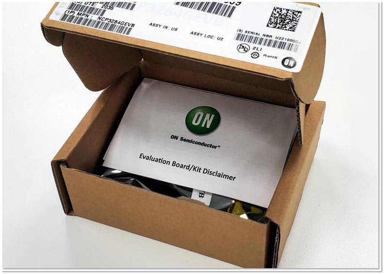 登登!首先是寄來時最初收到的盒子,外盒上印製標籤的型號 NCP3284GEVB,就是今天本文的主角 ( EVB ) 啦!