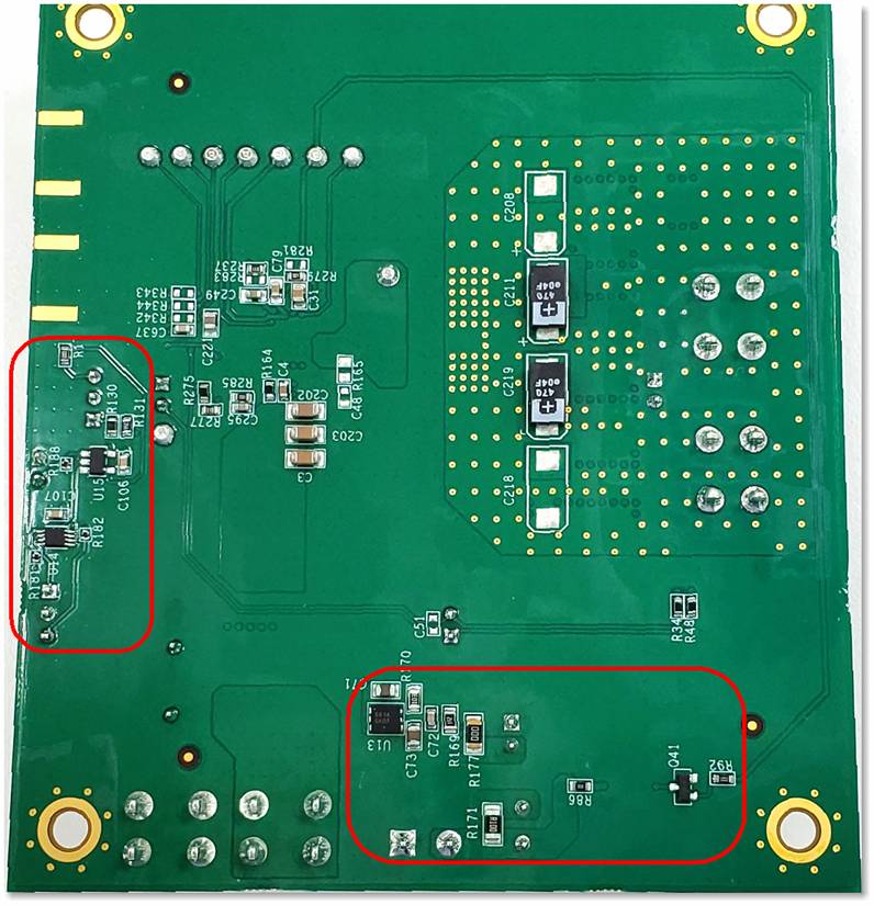 背面 PCB 看過去的樣子,相關周邊邏輯閘的控制晶片、LDO、MOSFET 等元件,都安排集中在背面的左側及下方兩區塊來做分佈。