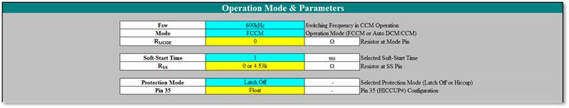 在第一項「Operation Mode & Parameters」裡,可以設定關於 NCP3284/A:工作頻率、運作模式 ( FCCM 或 Auto DCM/CCM )、緩啟動時間,及保護模式 ( Latch Off 或 Hiccup )。