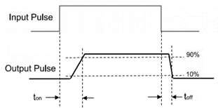 從輸入控制訊號開始到輸出轉態所需的時間,稱為開關時間(Ton/Toff)。如圖3所示,當輸入 端開啟後,一直到輸出端轉態至 90%準位所需的時間,稱作Ton(Turn on);當輸入端關閉後,一 直到輸出端轉態至 10%準位所需的時間,稱作Toff(Turn off)。