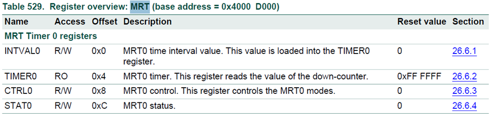 1. 先執行 MRT 模塊的初始化。設定 System control,透過 AHBCLKCTRL 啟動 MRT 模塊的 clock,並透過 PRESETCTRL 將其模塊重置