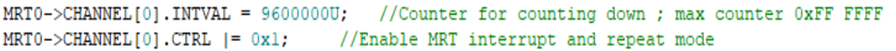 2. 設定 MRT CHANNEL 中 24 bits 的倒數時間間隔值,因 system clock is 96 MHz,欲產生 100 ms 計數,其計數量應為 9.6 M 次,並設置中斷及為重複模式