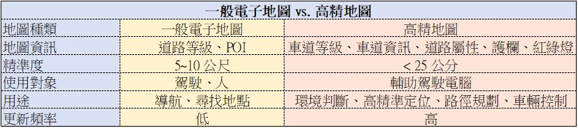 高精地圖,顧名思義就是比一般普通的地圖,在精準度及豐富度上有更高的要求的地圖,主要差別在於:一般電子地圖是給駕駛人看,而高精地圖則是給車子的系統看的,車子的輔助駕駛系統需要根據高精地圖,準確地知道自己所處位置、周圍情況來控制車輛。簡單的舉例來說,車輛是行駛在車道上,自動駕駛不是只有路徑上的安排,必須知道很多道路周圍的細節才能做到。