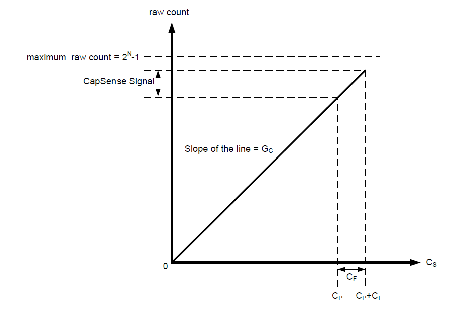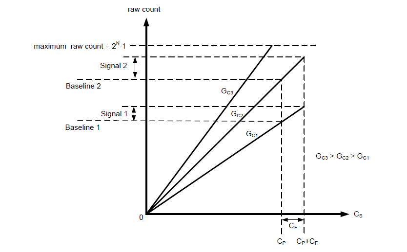 當傳感器上有手指觸摸時,原始計數將發生變化,這種變化被稱為CapSense 信號。圖1-3 顯示了信號變化值和轉換增益的關係。