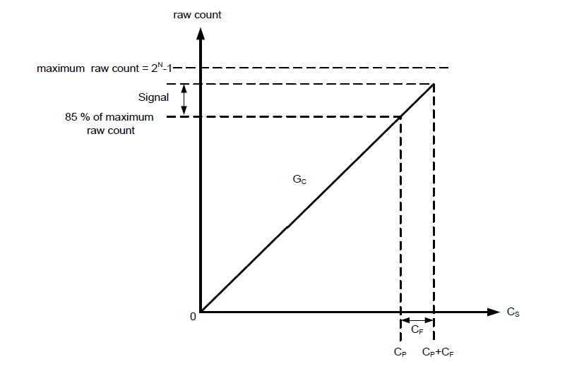 圖1-3顯示的是與三個轉換增益值相對應的三條關係線:GC3、GC2 和GC1。轉換增益增大會使信號值增大。但增大轉換增益值也會使與CP(即基線)相對應的原始計數值越來越靠近原始計數的最大值(2N-1)。增益值過大,原始計數會飽和,如GC3 所示。因此,為避免原始計數飽和,您應調整轉換增益的值,以得到良好的信號值。對CSD 參數進行調校。當傳感器上沒有發生手指觸摸時(即CS = CP)原始計數 = (2N-1)的85%,如圖5-12 所示。這樣能夠確保在增益值最大並且環境發生變化時,可以儘可能增大原始計數值,並且手指觸摸位置上不會發生飽和。