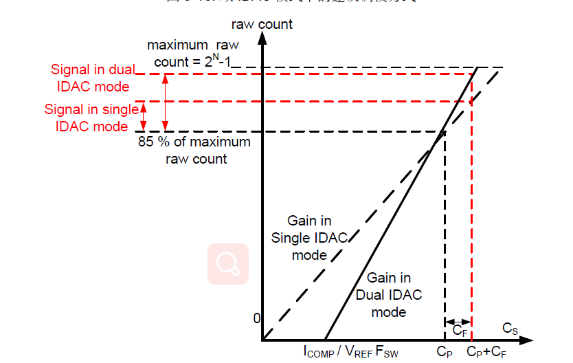 如圖1-5 所示, 在單IDAC 模式下85%的要求被限制為固定增值,而在雙IDAC 模式下,通過將CS 軸攔截向右移動(增加ICOMP)以及相應降低調製器IDAC(IMOD)可以增大增值。CS = CP 時仍獲取的原始計數為(2N-1)的85%。