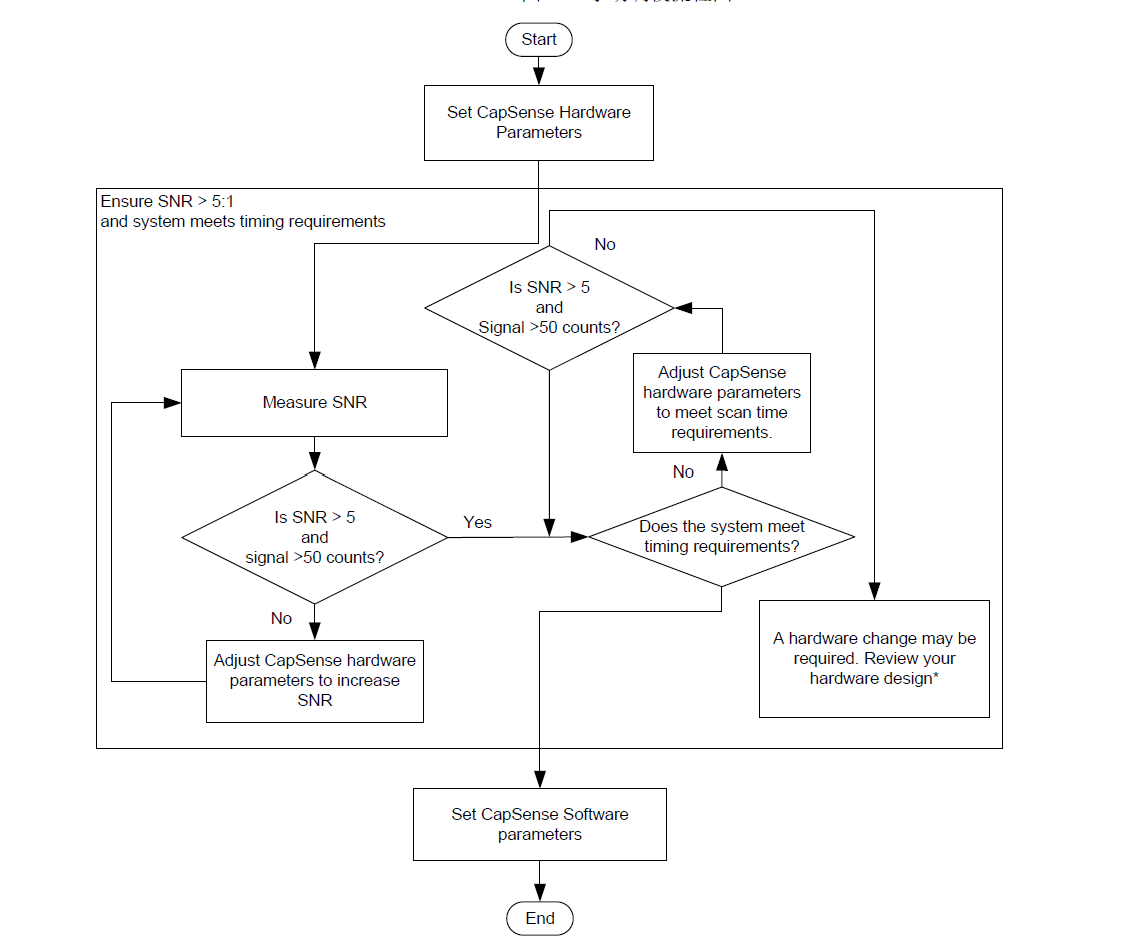 2. 調校CapSense 組件硬體參數,以確保信噪比大於5:1(信號不小於50 各計數),並且系統滿足各時序要求。