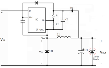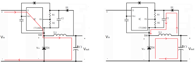 由於控制 IC 的 GND 腳接於 SW 處,而不是輸入與輸出的共 ( - ) 端,因此無法直接將輸出電壓 Vout 回授給控制 IC,必須透過轉換的方式。如下圖 2 ( b ) 所示,當 D1 導通時,SW 處電壓下降至趨近於 ( - ) 端電壓,此時 D2 會導通,輸出電壓透過 D2 對 C2 充電。正常清況下,C2 電壓會充電至輸出電壓。控制 IC 即利用回授此 C2 的電壓進行對輸出電壓的控制。
