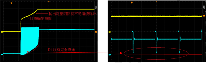 由以上原理分析可知,由於輸出電壓回授偵測是利用 D1 導通區間將 C2 充電到輸出電壓以偵測輸出電壓。當空載時,若電感 L1 電流小到不足以完全導通 D1 時,C2 電壓就無法充電至接近輸出電壓,因此回授電壓得不到正確的輸出電壓就會造成輸出電壓上升。下圖 3 實驗空載且無 dummy load 電阻條件:輸出電壓爬升到目標電壓後,L1 電流減小導致 D1 沒完全導通,此條件 C2 電壓充電不足,導致回授電壓與實際輸出電壓有差異,輸出電壓達目標電壓後還在繼續上升,如下圖3 左圖。