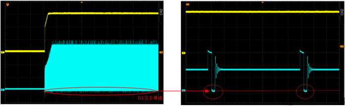 為了避免上述空載條件造成輸出電壓異常,可於輸出增加 dummy load . 原廠 demo board 文件有建議於輸出增加 Zener Diode 作為 dummy load,避免於空載或極輕載條件下,輸出電壓升高的問題。下圖 5 實驗空載條件但於輸出放置 16V Zener Diode,由圖可看到D1都有完全導通,因此輸出電壓正常穩定。