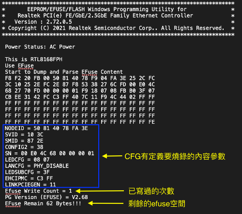 CMD視窗會秀出LAN IC efuse內容, 就可確認定義的CFG內容是否有正確燒進去~