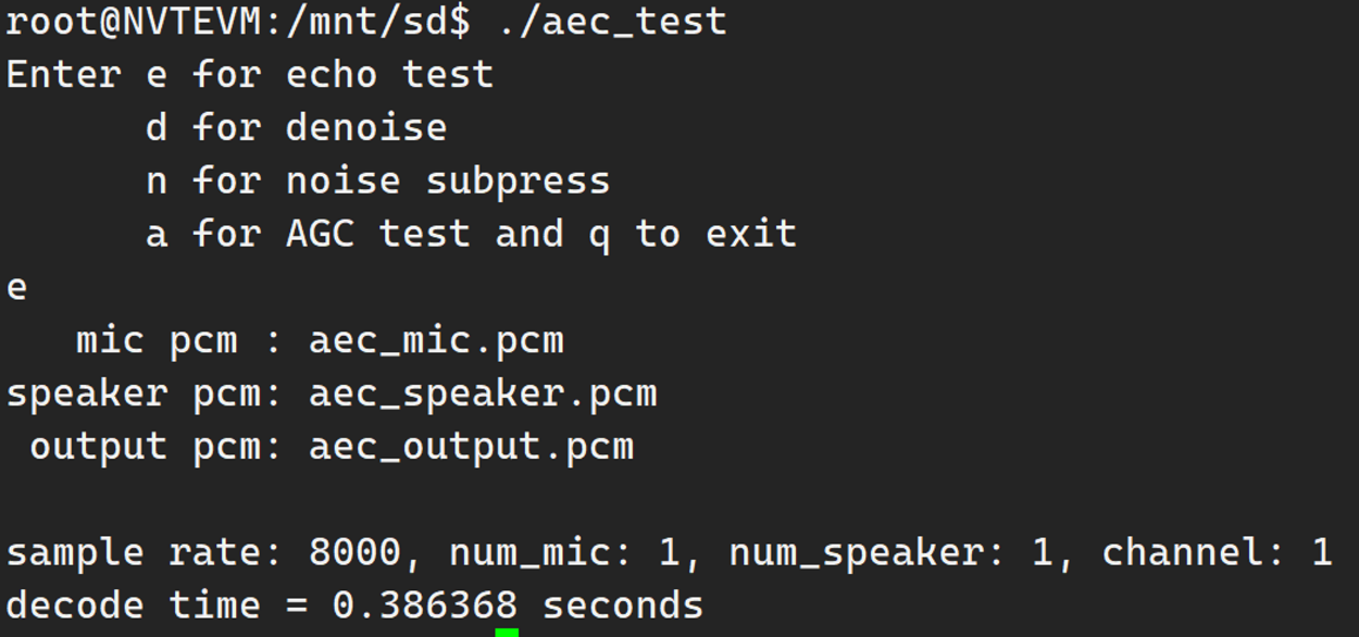 執行aec_test程式後,會出現選單,再輸入e便可執行AEC的測試,過程的中顯示的訊息如下: