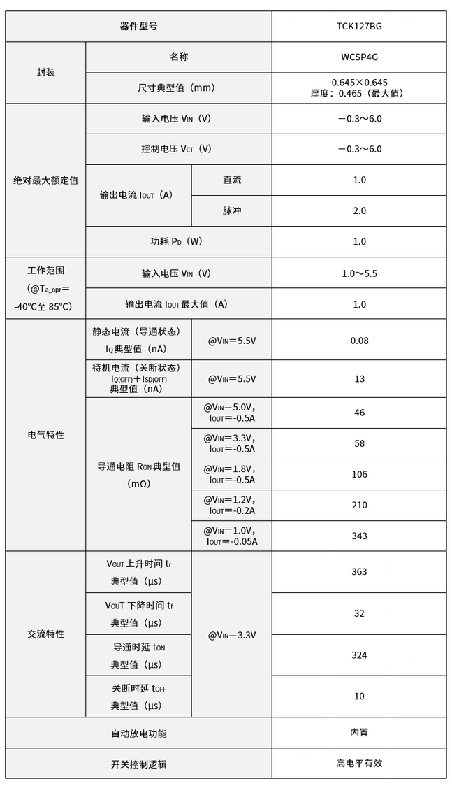 - TCK127BG負載開關支援在1V至5.5V寬電壓範圍內工作,具有高達1A的輸出電流,十分適用於負載在1A以內,要求寬電壓工作的產品;