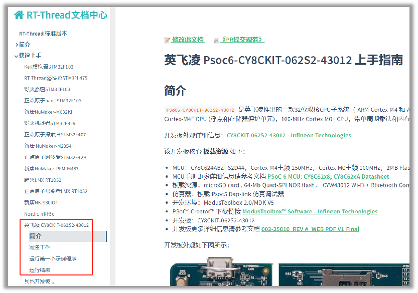 RT-Thread 文檔中心:英飛凌 CY8CKIT-062S2-43012 快速上手指南,方便快速上手開發。