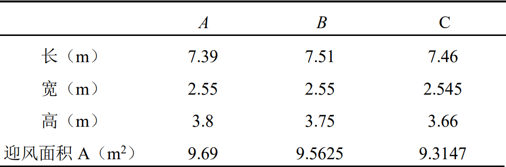 接下來通過對重卡的耗電量及電池自重來說明。表1 是選取的A、B、C三種不同品牌的車身尺寸,計算出迎風面積A,並求其平均值為9.52m²;選取重型牽引車和掛車的風阻係數Cd為0.704[3]。