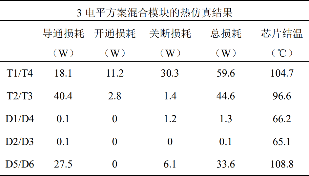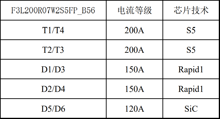 針對三電平Si IGBT配合SiC二極體混合模塊方案,其模塊配置如下表所示: