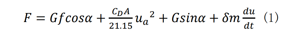 其中G代表汽車重力,f代表滾動阻力係數,α為道路坡角度,CD空氣阻力係數,A為迎風面積,ua為汽車相對速度,du/dt為直線行駛加速度,δ為汽車旋轉質量換算係數,m為汽車質量[4]。