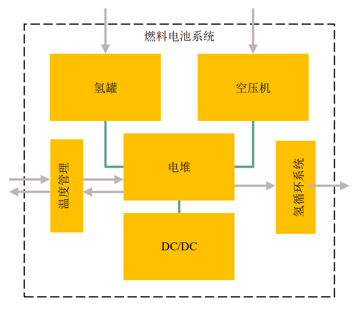 燃料電池電動傳動系統的核心是PEM(聚合物電解質膜)氫燃料電池堆,依靠氫和氧的反應產生驅動牽引電機所需的能量。此外,鋰電池用作中間存儲單元,可覆蓋加速期間的峰值負載以及制動期間的能量回收。半導體,也是燃料電池汽車的重要組成部分,在能量轉換的所有階段都發揮著重要作用。與電池供電電動汽車相比,燃料電池電動汽車包含以下額外子系統: