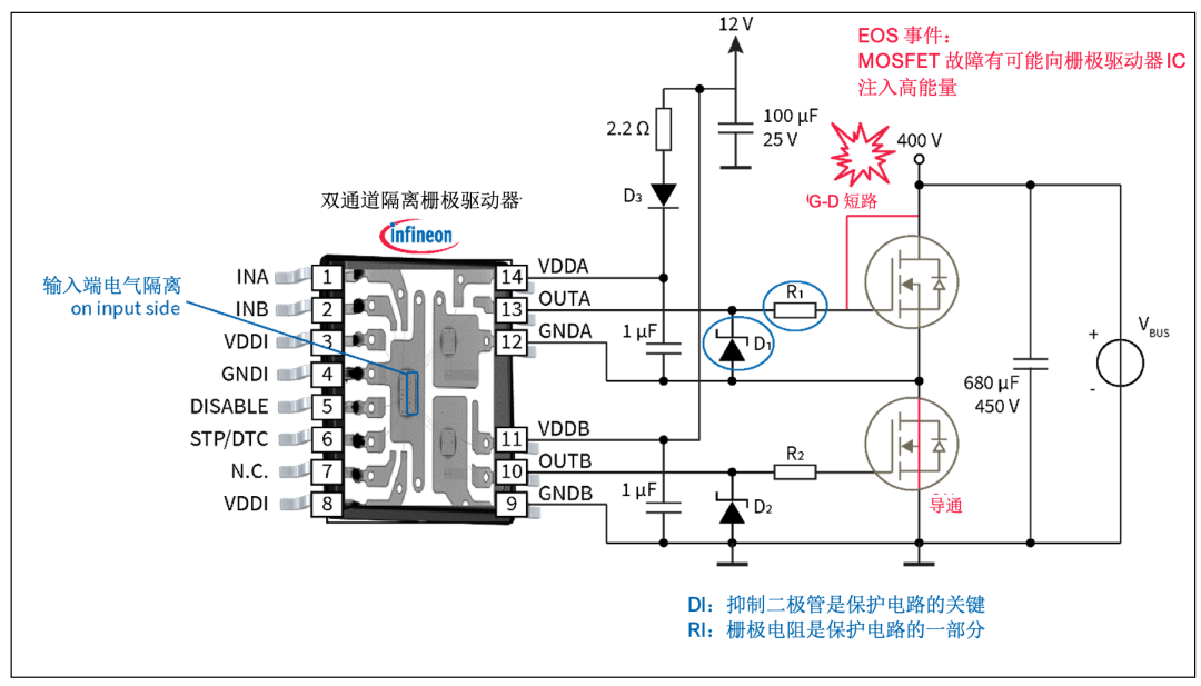 設想一下半橋中最壞的情況:高邊 MOSFET 柵極-漏極短路,而低邊 MOSFET 導通。在這種電氣過載(“EOS”)情況下,我們可以觀察到有超過 600 A 的電流流向柵極驅動器 IC 輸出端。因此,為了保護柵極驅動器 IC 輸出端,我們為柵極電阻 (R1) 補充了抑制二極體 (D1)(見圖1)。抑制二極體為柵極驅動器輸出端提供了旁路,將電流引導至半橋中點。因此,我們只要選擇了合適的應用設計,那麼柵極驅動器 IC 從輸出端到輸入端的隔離功能就能保持不變。