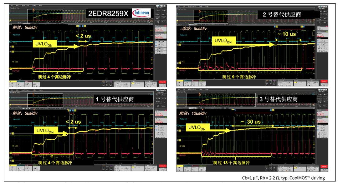 圖2. 最先進的雙通道隔離柵極驅動器 IC 的 UVLO 啟動時間比較