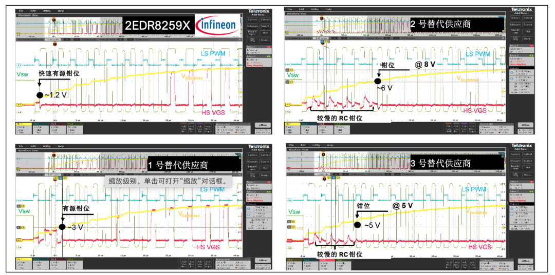 雖然柵極驅動器電源仍低於 UVLOon 閾值,但有源輸出鉗位為柵極驅動器 IC 輸出端提供了一條低阻抗接地路徑。這種最通用的方法可以避免在自舉啟動過程中出現半橋級擊穿事件。