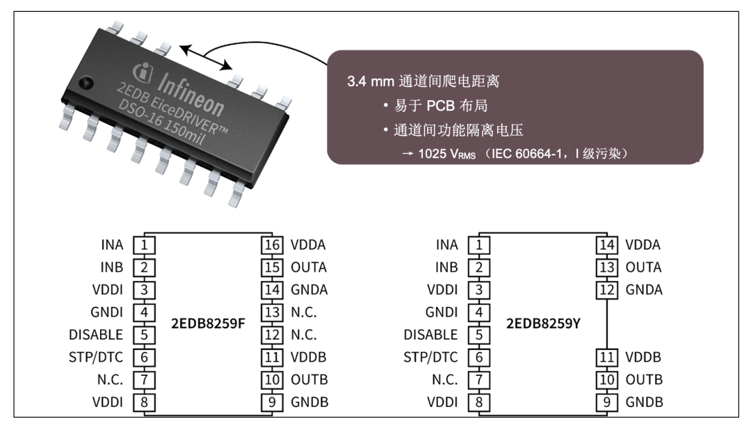 雙通道電氣隔離柵極驅動器 IC,採用 150 mil 和 300 mil DSO 封裝,通常採用 14 引腳配置。在柵極驅動器 IC 級,傳統的 16 引腳配置與越來越流行的 14 引腳配置之間的區別在於,先前輸出端的“空”腳實際上已不存在(圖 4)。