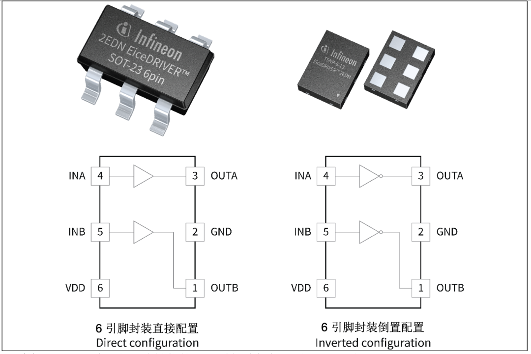 雙通道低邊柵極驅動器 IC 採用 6 引腳封裝(如有引腳 SOT-23,甚至像 TSNP 等無引腳超小型 1.1x1.5 mm2 6 引腳封裝),是非常實用且經濟高效的解決方案(圖 5)。這樣一來,柵極驅動器 IC 的所有優勢都將得以體現,例如數字導通/關斷特性、界定的 UVLO、5 A 強輸出級、個位數 ns 傳播延遲精度。同時,最大限度地降低了 PCB 面積占用,提高了 PCB 布局的靈活性。