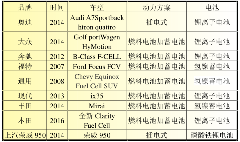 目前各大整車廠都投入了較大精力研發燃料電池車,其中以豐田本田等為代表。表1 是各整車廠目前所採用的動力方案。