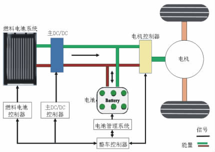 圖1是純燃料電池動力方案圖,在這種方案中汽車所需的所有動力全部來自燃料電池電堆。