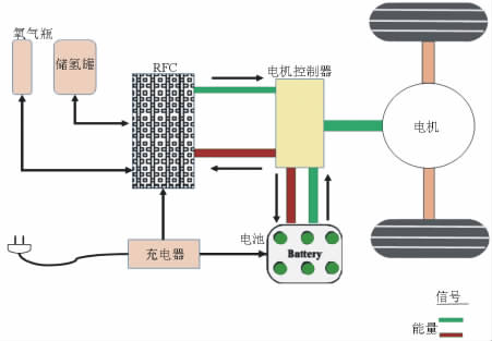 這種方案有兩種配置方式:第一種是基於目前加氫設施不足,在車上裝一個 RFC(regenerative fuel cell)裝置,這個裝置有兩種運行模式,當充電器充電時,RFC 是一個電解槽,生成的氫氣和氧氣分別存到相應的高壓氫氣瓶和氧氣瓶中。當汽車行駛時,RFC 是一個典型的燃料電池裝置,利用電解槽生成的氧氣氫氣進行反應提供電能,同時生成水。其動力系統結構如圖 6 所示。