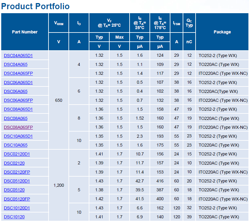 - 低順向電壓 (VF) 可進一步提高效率、降低功率損耗和營運成本。