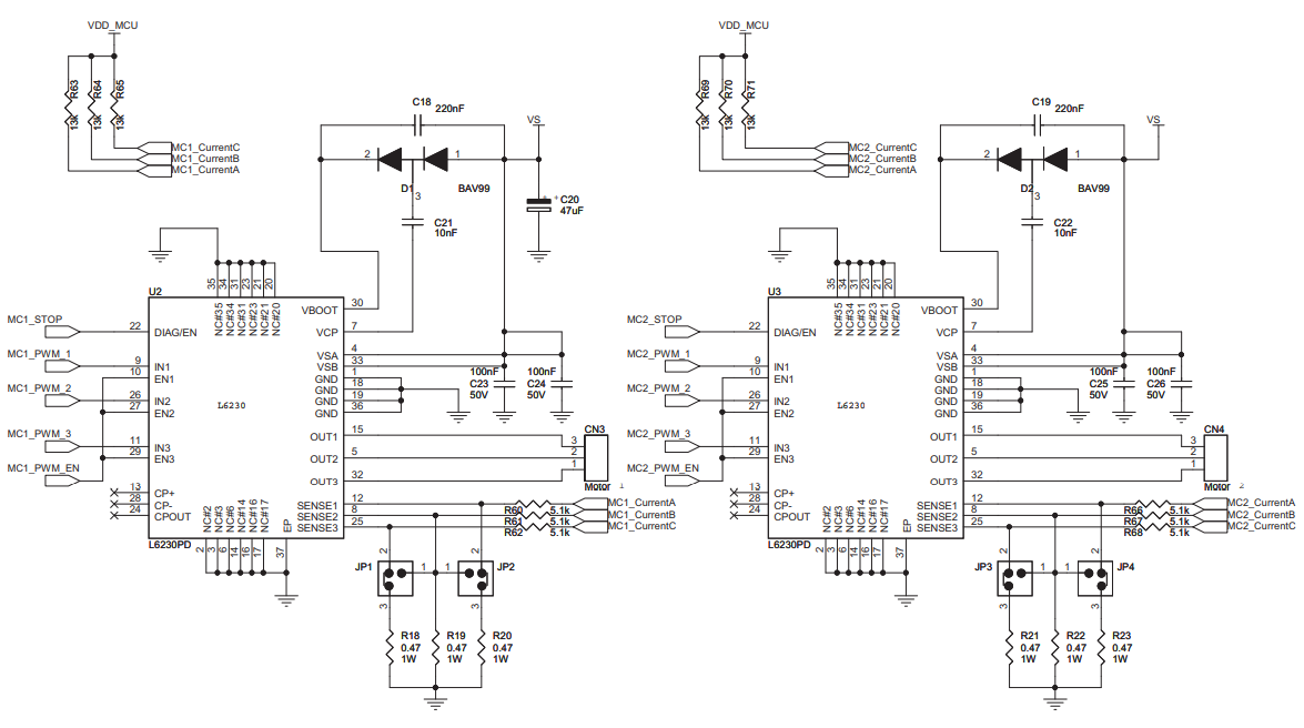 板載2顆獨立的,具有過流保護DMOS L6230, 使用BCD多功率技術,將隔離式DMOS功率電晶體與CMOS和雙極性電路集成在同一晶片上;