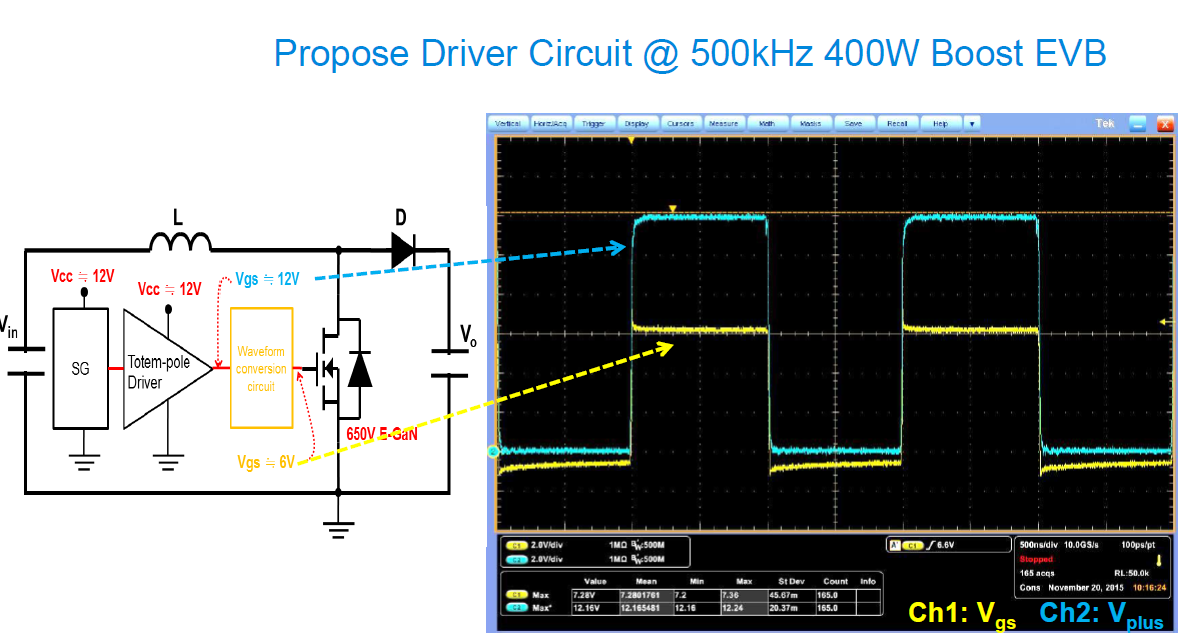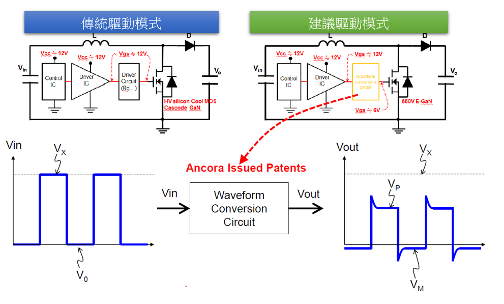 從圖片中可以看出,totem pole driver IC提供的電壓為12V的PWM訊號輸出,此電壓是無法驅動E-GaN。所以透過專利電路主要的動作就是將電壓降成適合E-GaN動作的≒6V電壓且提供負電壓關斷,可針對高頻切換所產生noise的地方增加對抗雜訊的能力。