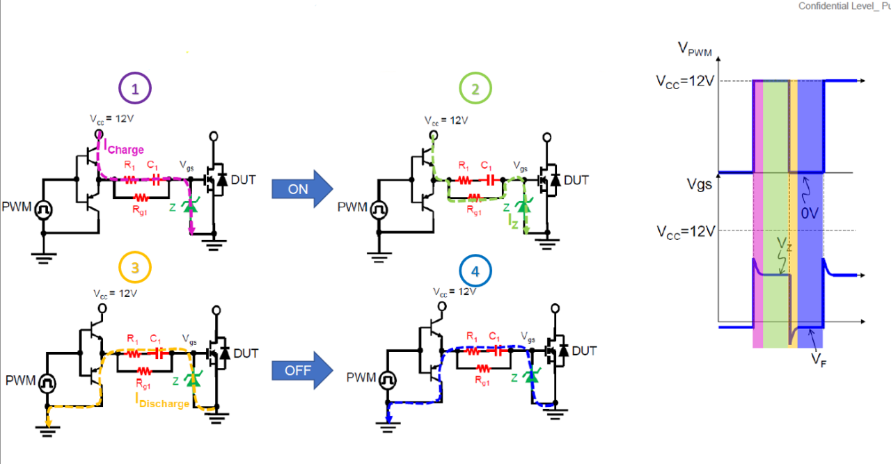 動作1:當驅動DUT導通瞬間 ,Vcc提供12V驅動,Icharge會通過阻抗較小的R1與暫態時為短路的C1與Z充電.直到Z雪崩崩潰導通時,可以看到右圖Vz的部分有overshoot後,電壓會箝制在6V.這時會開始對C1充電至6V.
