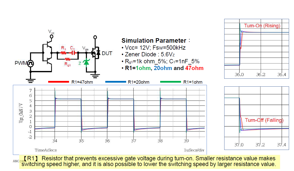 假設我們要加快turn on與turn off的速度,我們可以調整R1的數值來達成。