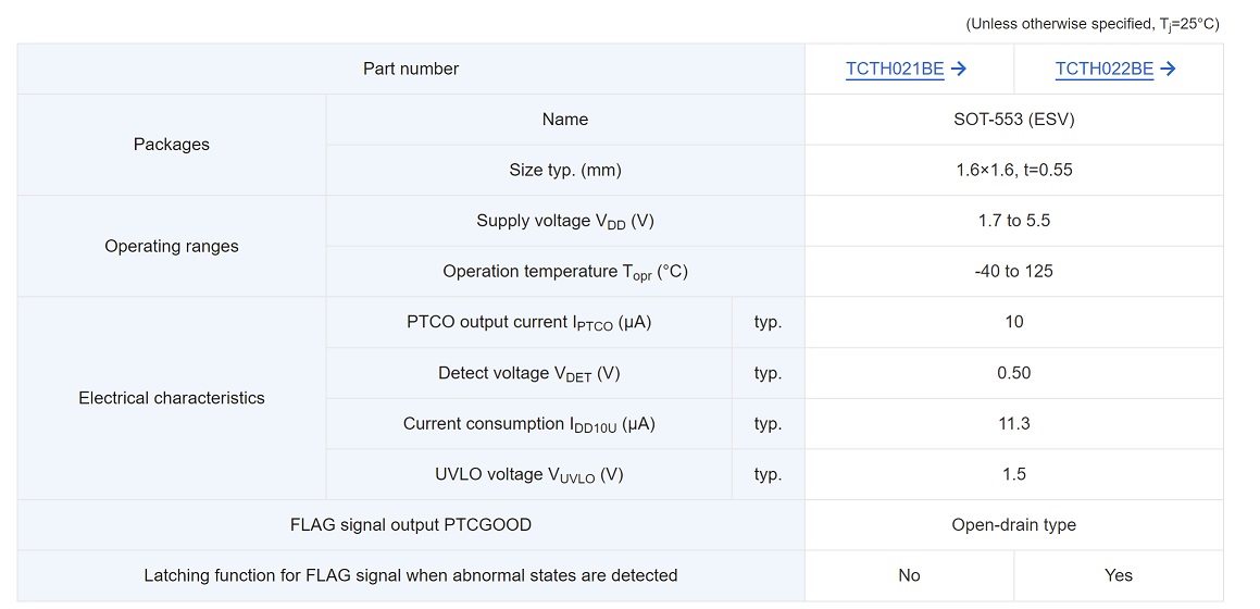 TCTH022BE” FLAG信號檢測帶鎖存功能。它們利用正溫度係數(PTC)熱敏電阻在簡單的電路配置中檢測電子設備內部的溫升。