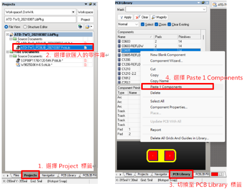 切換到 Project 標籤,選擇欲匯入的 PCB Library 元件庫後,再切換至PCB Library 標籤。並在 Components 欄位內按下滑鼠右鍵並點選 Paste 1 components,即可將元件匯入到元件庫。