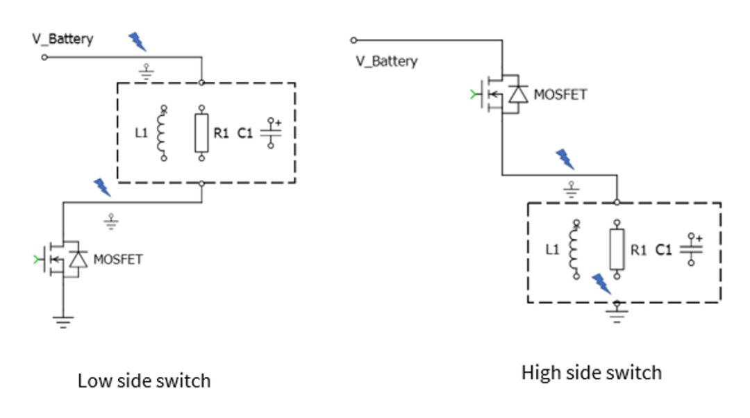 智能功率開關分為智能高邊開關和低邊開關。顧名思義,高邊開關(High side switch)表示功率開關處於負載高電勢的一側,即電池和負載之間。而低邊開關(Low side switch)處於負載的低電勢一側,通常是在負載和地之間。