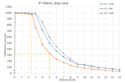 圖9 為反射物灰卡配合 50mA 的 IF 做改變 RL 的測試,可發現當 RL 降低到 68k ohm 時,可判斷 的範圍會降低到 0.1~4.5cm。