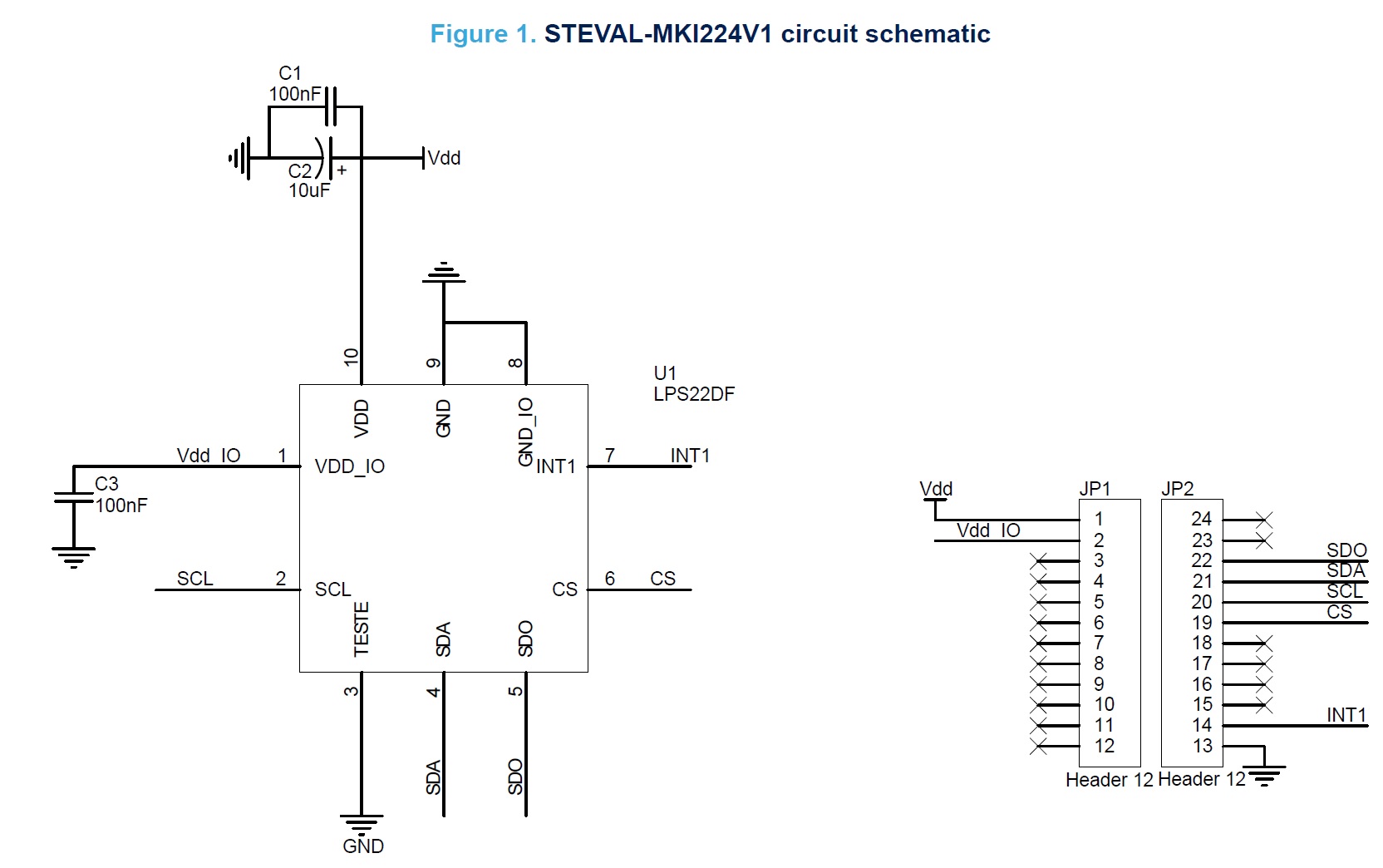 适配器提供完整的 LPS22DF 引出线,并可随时使用所需的VDD 电源线上的去耦电容。