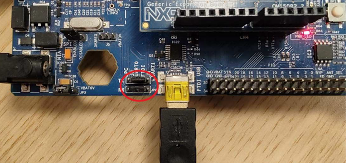 使用 mini USB cable 上電如下圖下方紅框處, 左側處有 TX RX 的 J4 與 J7 jumper ,