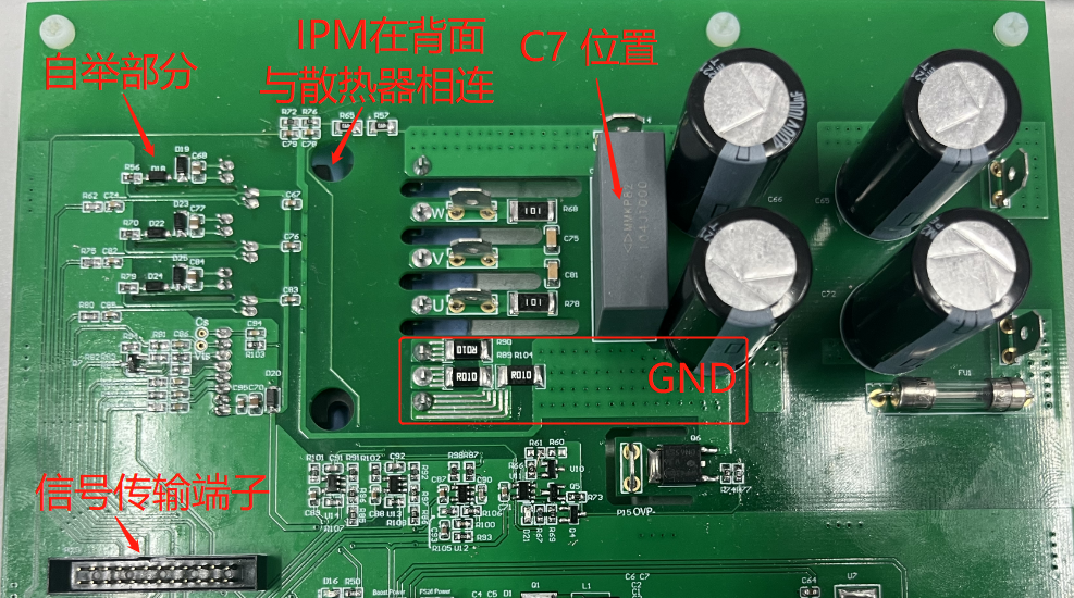 1、PN 電源間的電容器 C7 應儘可能的靠近 IPM 的引腳擺放,整個功率環路儘可能的短並進行鋪銅處理。